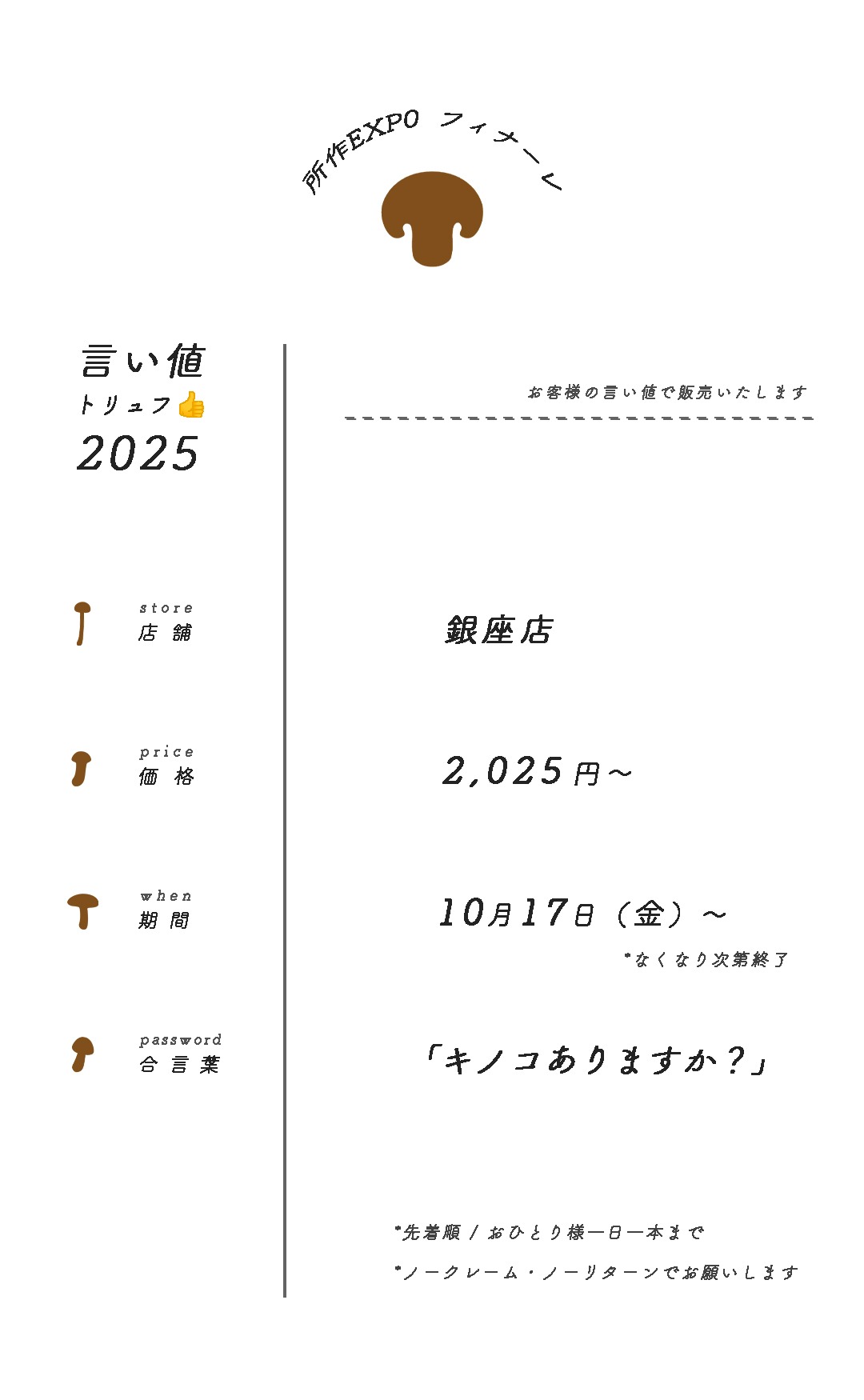 この「言い値👍トリュフ2025 in 所作EXP0」の盛り上がり次第?によっては、フィナーレブログ後編にも繋がります。ぜひ手にとって、トリュフcp、キノコへの想い?所作EXP0への感想やご要望をお待ちしております。みなさまと後編をつくらせてください(詳しくは銀座店スタッフまで)。