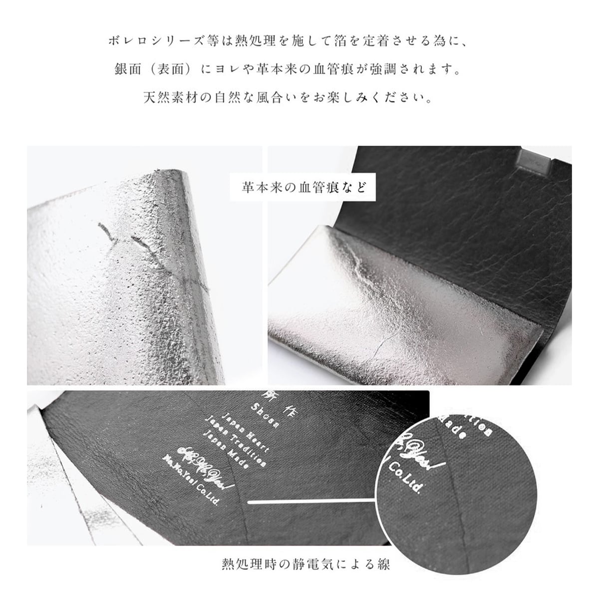 ボレロシリーズ等は熱処理を施して箔を定着させる為に、銀面(表面)にヨレや革本来の血管痕が強調されます。天然素材の自然な風合いをお楽しみください。